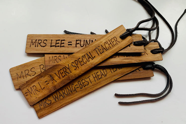 We love our oak book marks just engraved simply with BOOKMARK and personalised with our own choice of words in equal measures.