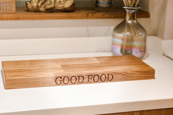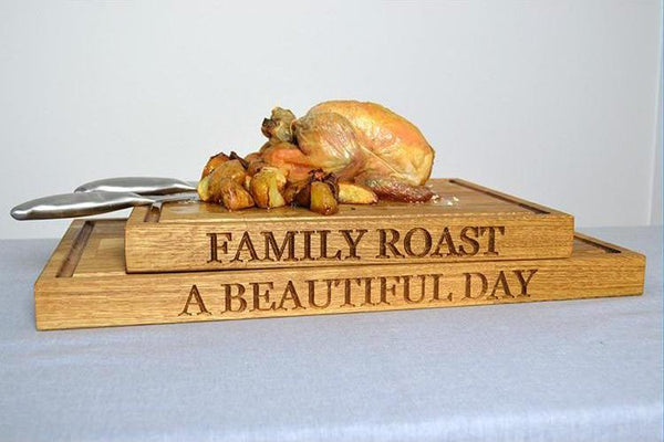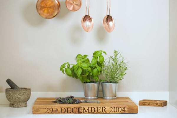 Our Personalised Oak Chopping boards are all manufactured from high quality European Oak. They are carefully hand crafted and finished providing incomparable strength and durability. Oak chopping boards will mature and darken gradually, deepening to perfection over time. Our chopping boards are the perfect gift and can be personalised with the words of your choice, to suit any occasion. All of our boards are hand treated with mineral oil which is food safe and nut free.