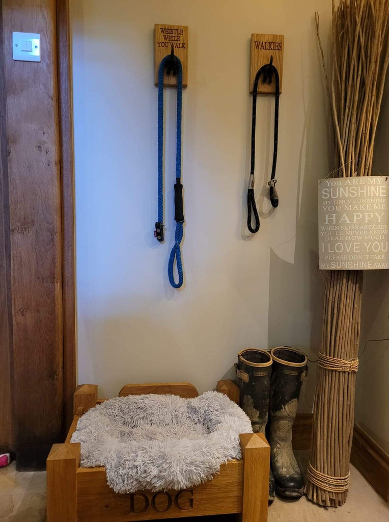 A gorgeous solid oak dog lead hook featuring a beautifully solid cast iron "wagging" tail hook engraved with your choice of words. When you reach for your best friends lead their tail will be wagging with enthusiasm.