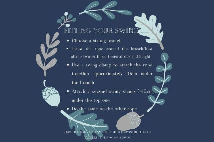 NOTE: It is the customers responsibility to hang the swing correctly. Please ensure that you have fixed the rope and swing safety and securely from a tree or swing frame before you attempt to swing on it. From the oak Tree can not take responsibility for poor fitting.